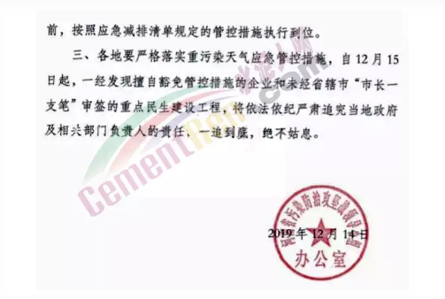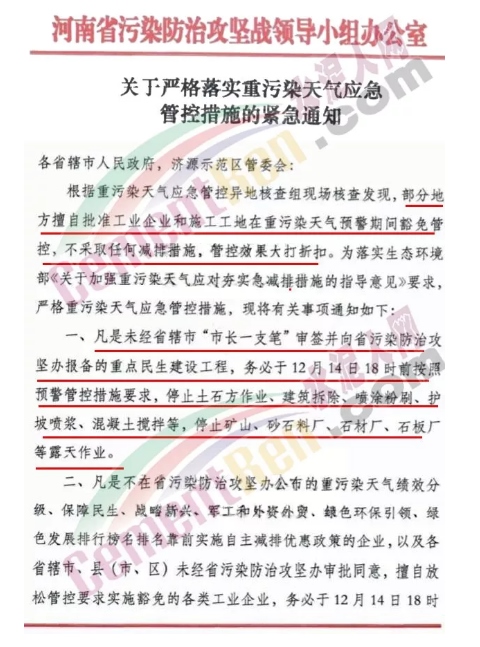上述通知要求,凡是未經省轄市”“市長一支筆”審簽并向省污染防治攻堅辦報備的重點民生建設工程,務必于12月14日18時前按照預警管控措施要求,停止土石方作業、建筑拆拆除、噴涂粉刷、護坡噴漿、混凝土攪拌等,停止礦山、砂石料廠、石板廠、石材廠等露天作業。