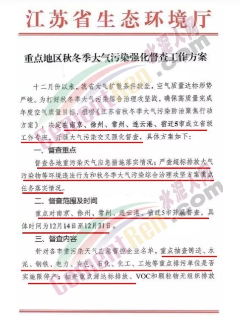 同期,江蘇省生態環境廳發布《重點地區秋冬季大氣污染強化督查工作方案》指出督查范圍為南京、徐州、常州、連云港、宿遷5市開展督查,具體時間為12月14日至12月31日。針對各市重污染天氣應急管控企業名單,重點抽查鑄造、水泥、鋼鐵、電力、有色、石化、化工、工地等重點排污單位 是否實施停限產;抽查重點源達標排放VOC顆粒物無組織排放情況,是否存在 無治污設計 ,偷排、篡改或者偽造監測數據、不正常運行大氣污染物防治設施等逃避監管的方式排放大氣污染物和chao標排污等環境違法行為等。方案全文如下: