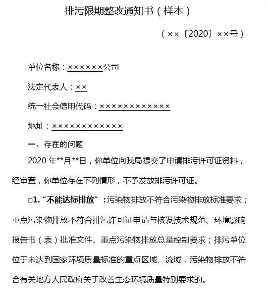 (一)正文。內(nèi)容包括排污單位名稱、法定代表人或者主要負(fù)責(zé)人、生產(chǎn)經(jīng)營(yíng)場(chǎng)所所在地、統(tǒng)一社會(huì)信用代碼等企業(yè)基本信息,載明整改問題類型和整改時(shí)限,告知排污單位整改要求和逾期未完成整改的法律后果。