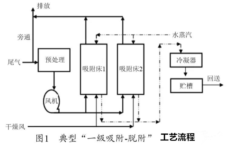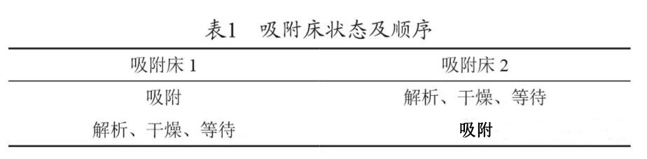 尾氣經收集后輸送至吸附-脫附系統,首先經預處理系統(如冷凝、吸收、過濾)去除廢氣中的水汽、腐蝕性物質及顆粒物,防止末端設備腐蝕和吸附劑堵塞,同時降低末端負荷;然后流經吸附床,廢氣中的污染物吸附在吸附劑上,凈化達標后高空排放;吸附劑飽和后通過閥門切換至另一吸附床,飽和后的吸附劑采用低壓水蒸氣高溫解析_,污染物氣化并脫離吸附劑,隨水蒸氣進入冷凝系統,并在貯槽中分層為水相和油相,其中水相送污水站處理,油相即有機溶劑,精制后可回收套用;_后的吸附劑殘有大氣水分,影響吸附效率,需要通過空氣進行干燥,干燥后的吸附床等待另一吸附床飽和;_后循環往復,自動切換,吸附床狀態及順序如表1所示。