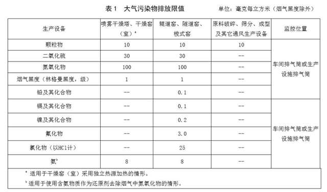 《排放標準》規定了陶瓷工業企業或生產設施的大氣污染物排放限值及控制要求、大氣污染物監測、達標 判定要求和實施與監督。