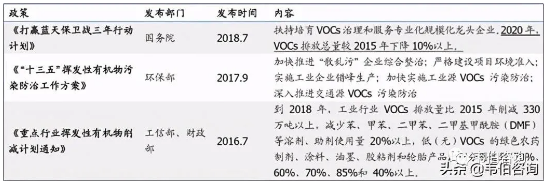2017年1月,國務院印發《“十三五”節能減排綜合工作方案》,提出實施石化、化工、工業涂裝、包裝印刷等重點行業VOCs治理工程,到2020年石化企業基本完成VOCs治理,_VOCs排放總量比2015年下降10%以上。