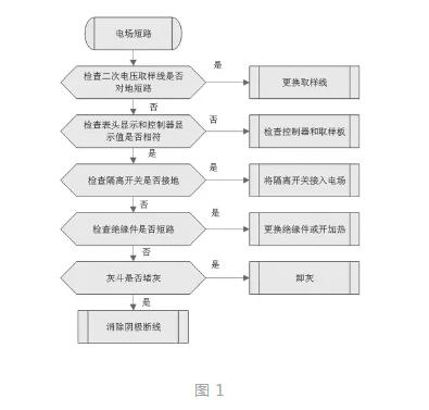 (2)預測性維護模型。靜電除塵設備常見的故障為陰極線斷線,振打失靈,絕緣子破裂、灰斗堵灰形成電場短路。以電場短路為例,其判斷邏輯及維護操作如圖 1 所示。
